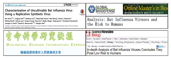 成功拯救无法体外培养的蝙蝠H17N10病毒,揭示其对哺乳动物致病性以及蝙蝠是流感新宿主,结果发表在Plos Pathogens (IF="7.8), 被媒体报道百余次。